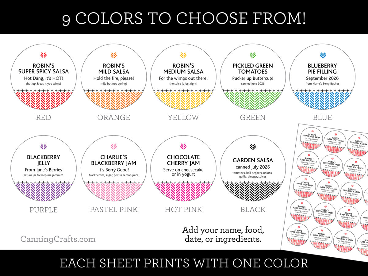 Round canning labels are sold by the sheet in 2 sizes. Not sure what size canning label you need? Please see our canning jar label size chart.